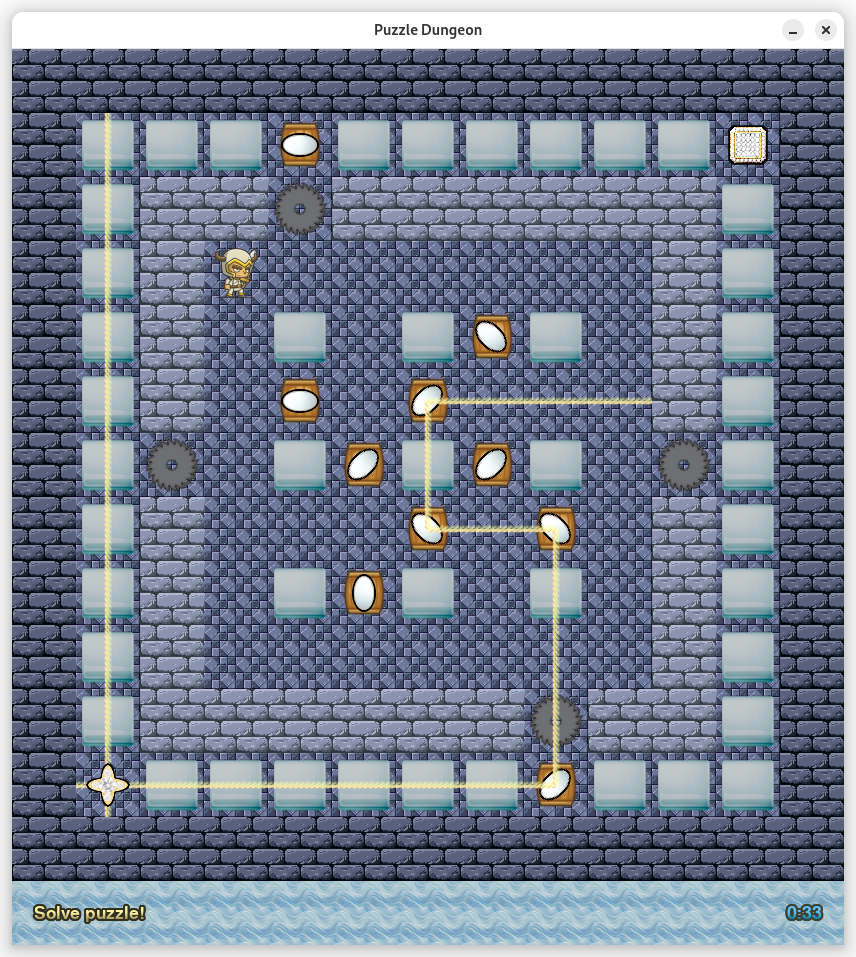 The beam is emitted from the generator in four directions: left, right, up, and down. Each direction of the beam proceeds cell by cell until it is reflected, redirected, or terminates. The beam continues through empty floor cells, void cells, glass, sand, open gates, trap cells, portals, and also through barrels, enemies, the character, and mirrors. It is terminated by walls and locks. If it enters a portal, it instantly appears at the paired portal in the same direction. Portals do not reflect or bypass; they relocate the beam to the peer.